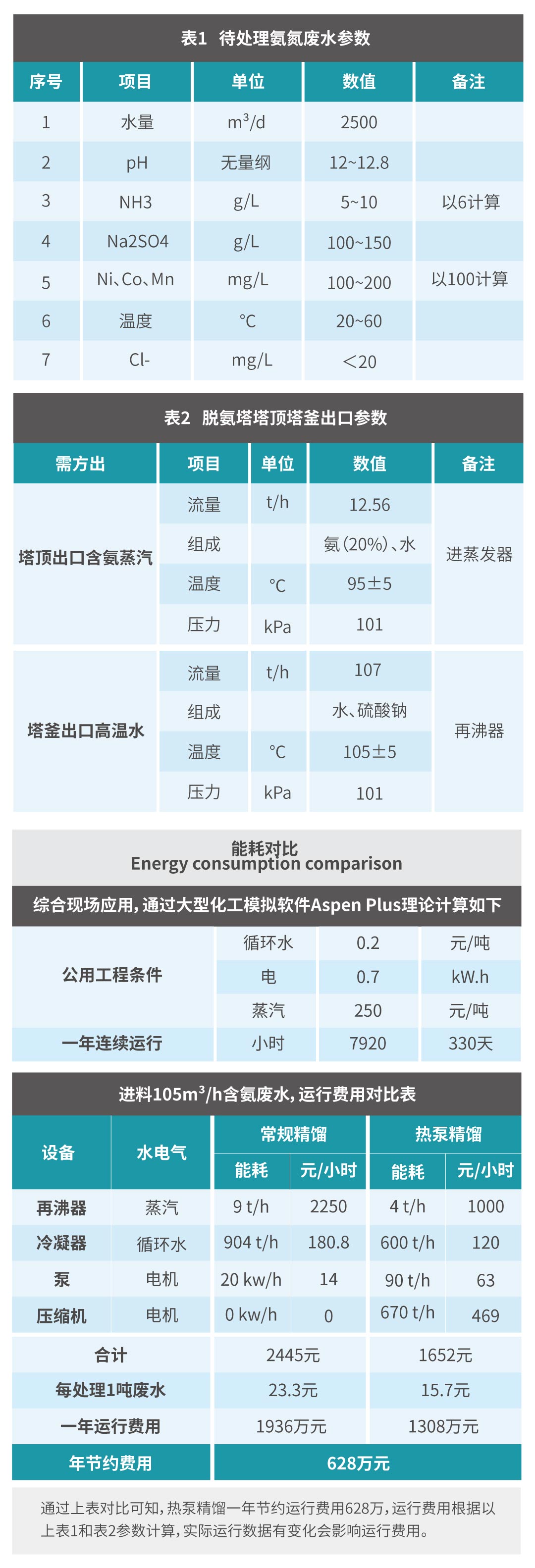 以荊門市某新材料有限公司2500m3/d氨氮廢水資源化處理系統為例,在經過熱泵精餾改造后,綜合可節省運行費用30%以上,年節約費用約628萬元。