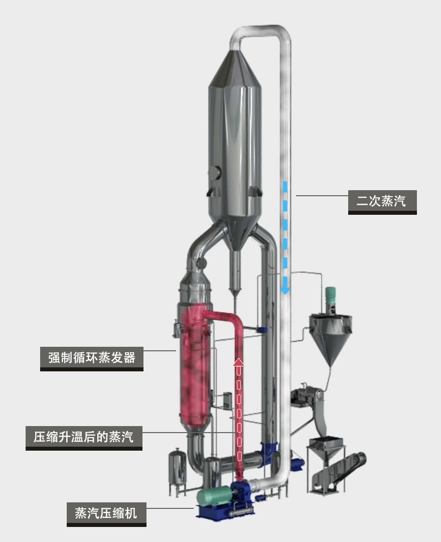 MVR技術是使用蒸汽壓縮機對蒸發器產生的二次蒸汽進行壓縮做功,從而提高蒸汽的壓力和溫度,升溫后的蒸汽再返回蒸發器中進行換熱蒸發。由于維持蒸發的熱量全部來自于壓縮機的做功,因此蒸發過程中不再消耗生蒸汽,生蒸汽僅用于物料的預熱。